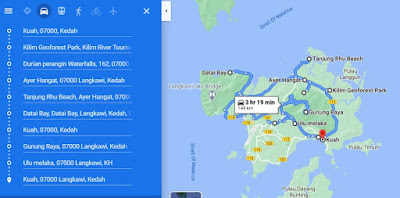 Di Langkawi. Lakaran mudah 144 km. Lihat sini. Jarak sebenar termasuk perjalanan naik bot di 3 lokasi berlainan iaitu Kilim Geoforest (sekitar 10 km), Tanjung Rhu membawa ke Gua Cherita (sekitar 12 km) dan Kuah membawa ke Pulau Dayang Bunting (sekitar 42 km) harus lebih 210 km.